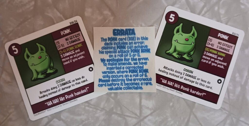 The PONK card (B18) included in some copies of Set B: The Biscuit Sisters Vs. The Gravy Brothers Set (and all of the one hundred copies of the The Squirmish Limited 2024 Artist Edition Battle Tin) includes an error, claiming PONK can achieve his special attack PONK BONK on a roll of 5 or 6. We apologize for the error. To make amends, if you purchased one of these erroneous cards, reply to this email with your address if you want me to mail you a corrected version where PONK BONK only occurs on a roll of 6. Please destroy the erroneous card before it becomes a rare, valuable collectable.